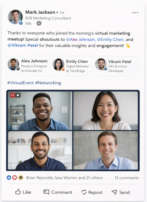Online virtual networking[Screenshot Showing Example LinkedIn post tagging participants]
