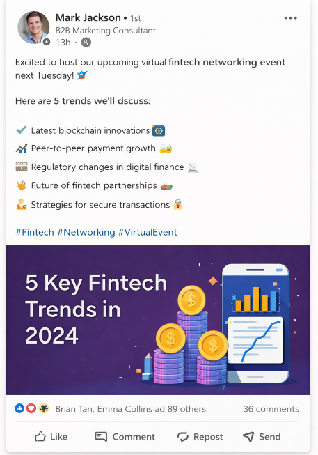 During a virtual fintech panel, I posted my key takeaways and actionable insights on LinkedIn, tagging panelists and attendees. Within a week, I gained several meaningful connections who later collaborated on projects.