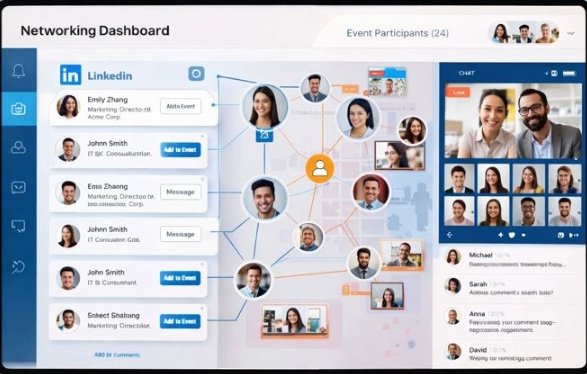 Professional networking dashboard showing LinkedIn connections and virtual event participants connecting online.